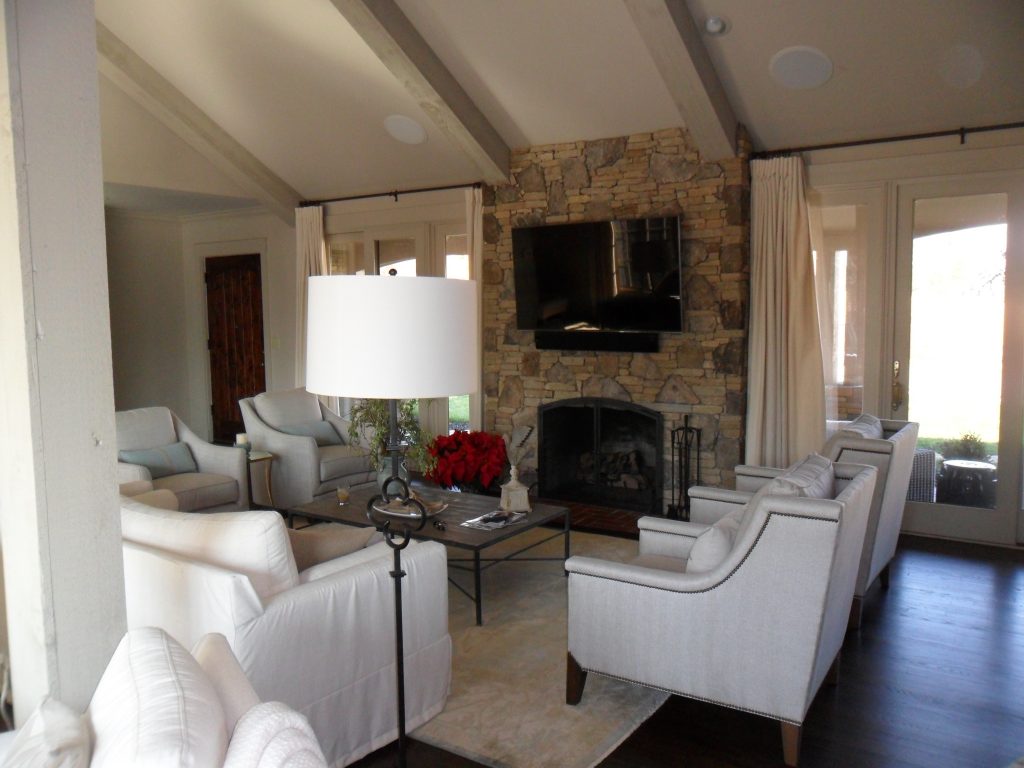 We built a new screen porch with outdoor kitchen, stone fireplace, columns & floor and a tongue in groove vaulted ceiling. A tiered patio with boulders, in-ground pool and sunning areas completes the backyard oasis. It’s the perfect escape after a long day. The doors open all the way up across the front and back of the house to make the most of entertaining in this gorgeous home!